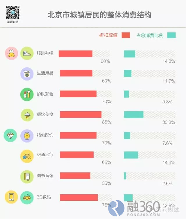 为了便于计算整体消费的折扣,对最佳消费折扣取区间中值,并以北京市城镇居民的消费数据计算整体消费结构,整理后为: