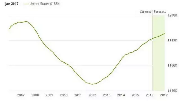 在中国一线城市的房价一直在涨,在美国就难说,下面是2007年-2017年美国的房价走势图: