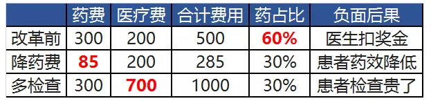 另一方面,作为“玩指标”的世界第一大国,我们完全有理由担心,医院会通过降低药费(减小分子),提高医疗费(增大分母),完成 “药占比”的考核。如下表预测:
