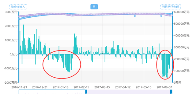 再看这个数据,之前每天流入1.5亿,之后突然半个月每天流出5000万,这是怎么回事呢?答案是平台没发标,这是宜人贷。