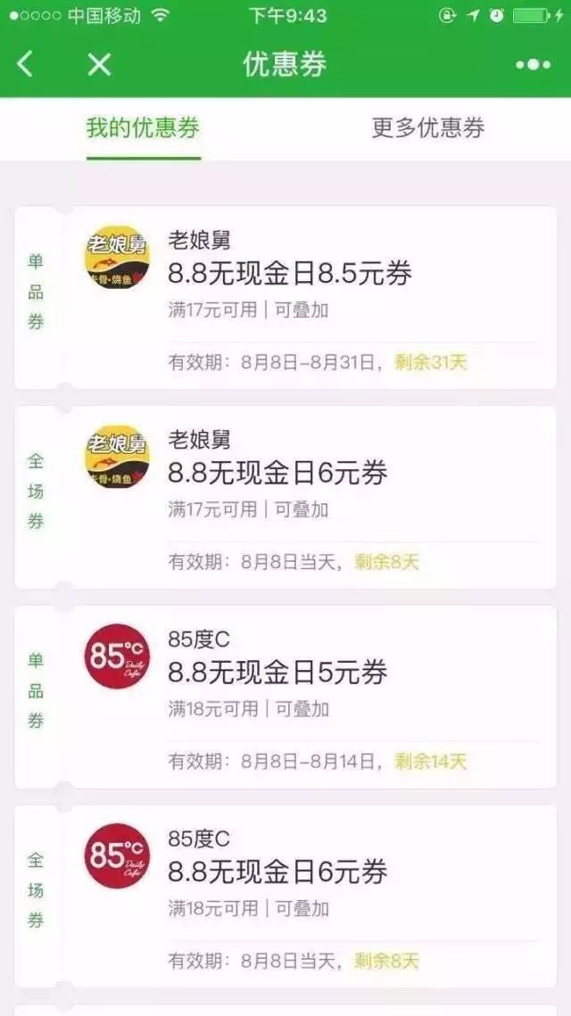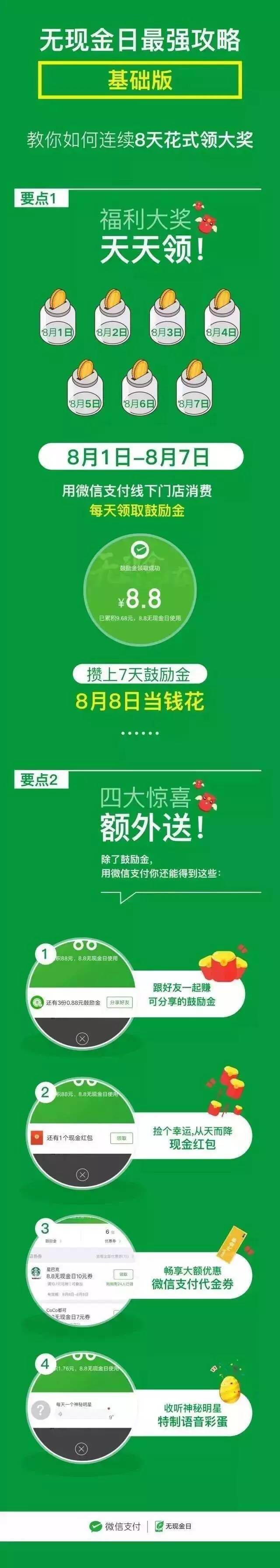 第一招:8.1~8.7使用微信到店支付,都可以获得鼓励金以及其他福利,这些都可以在8.8当天直接“当钱花”。