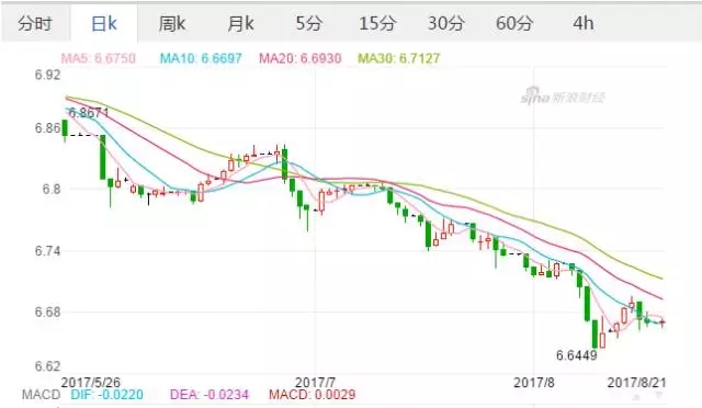 从5份月到现在,美元兑人民币汇率曲线呈现出明显的下降趋势。从5月26日的6.873到8月21日的6.675,近三个月的时间内美元兑人民币汇率下降了2.97%。