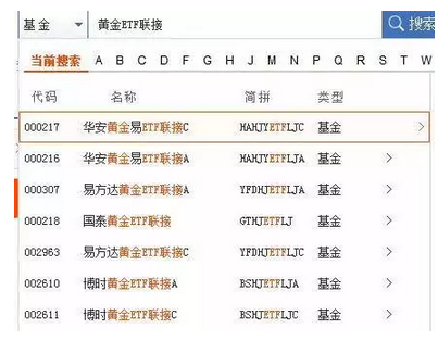 如下图我们可以看到,黄金ETF联接的名字基本上就是它们对应的黄金ETF基金后加上“联接”两个字: