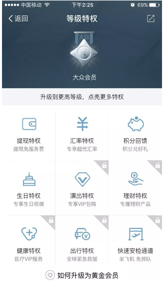 从大的来讲,马爸爸会给我们积分评级。积分有4个等级,从低到高分别是大众、黄金、铂金、钻石,等级越高特权越多。