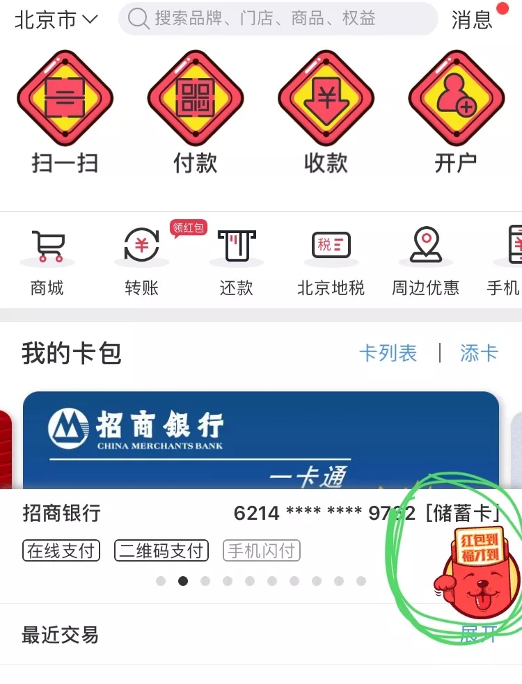 打开云闪付APP首页,有一个一动一动的小狗图标,点击它就行了。