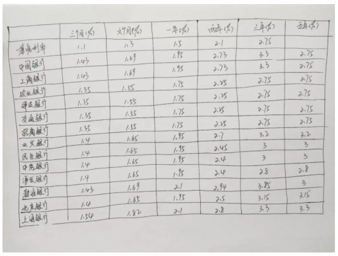 据老爷子说,他每天至少能转三家银行,为便于横向对比,还自制了一个银行定存利率表。