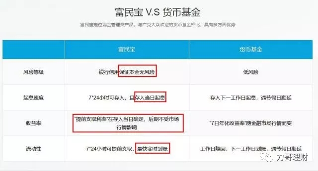 该行官网将富民宝和货基从风险等级、起息速度、收益率和流动性四方面进行了对比。