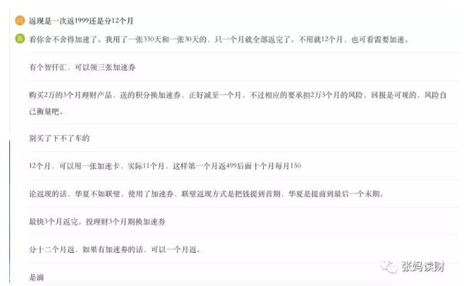 如果想缩短返现时间,可通过投资理财获得加速券,那么最长12个月的返现时间就有可能缩短到1个月。