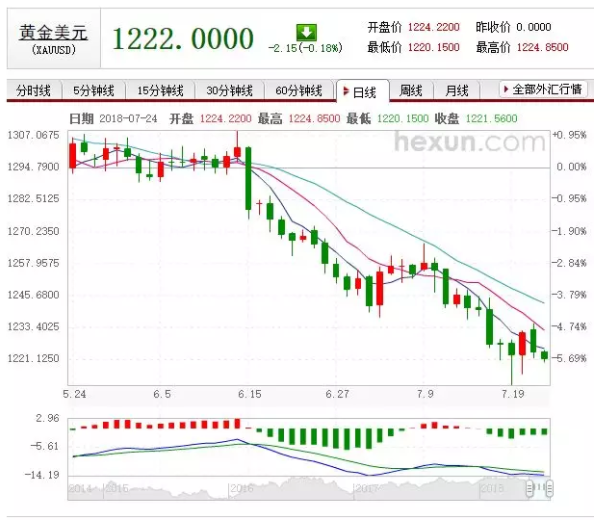 通过上图可以发现,近期受到强势美元打压,金价持续下滑,接连失守1240、1230美元两大关口,创去年7月中旬以来新低。