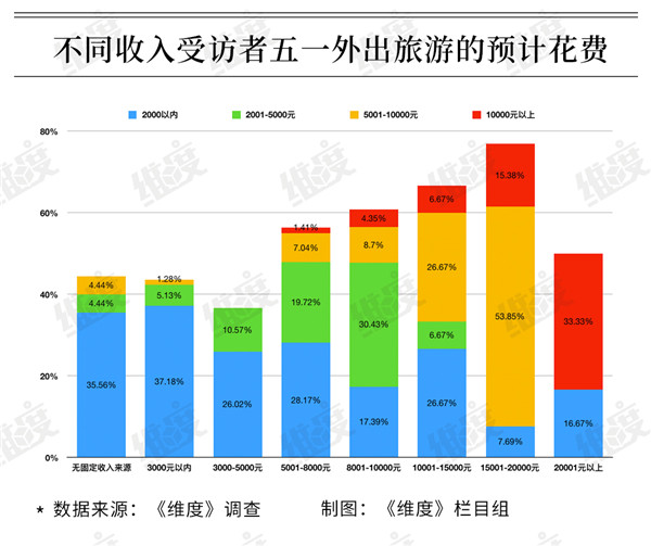 不难想象,从薪资水平来看,收入越高的,越倾向远途旅行。月收入10001-15000元的受访者是最多选择国内游的人群,占比26.67%;而月收入在2万元以上的,计划去国外游的人群超过三分之一。此外,显而易见,收入越高,五一出行的旅游花费也越高。
