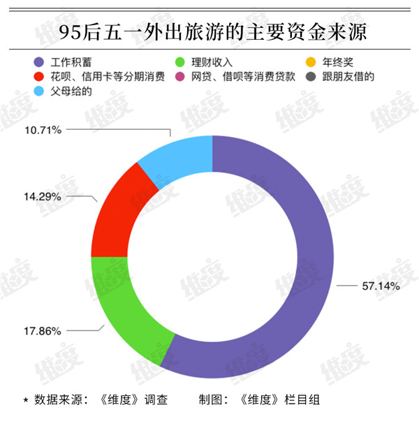 但最令人吃惊的是,相比总计超过7成受访者的旅游资金来源于工作积蓄,在95后受访群体中,可谓冰火两重天,一边是17.86%来自理财收入,一边则是14.29%来自分期消费,还有10.71%靠父母给。换句话说,有四分之一的95后五一出游全靠“支援”——“借钱”也要出去玩。