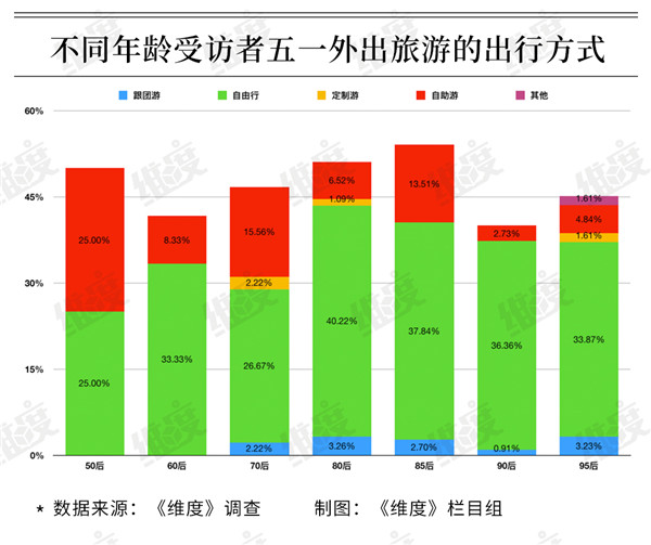 根据《维度》的调查,超过4成受访者在五一期间有出游计划,比去年十一的同比数据增长15.31%。具体来看,以市内周边游居多,还有13.26%选择国内游。有意思的是,如果从年龄上进行区分,《维度》发现,60后最宅、70后加班最多,85后出国最多。