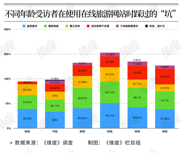 当调查受访者所遭遇的旅游陷阱主要发生场景时,在线旅游平台的占比18.75%,在95后中,更是超过了2成。