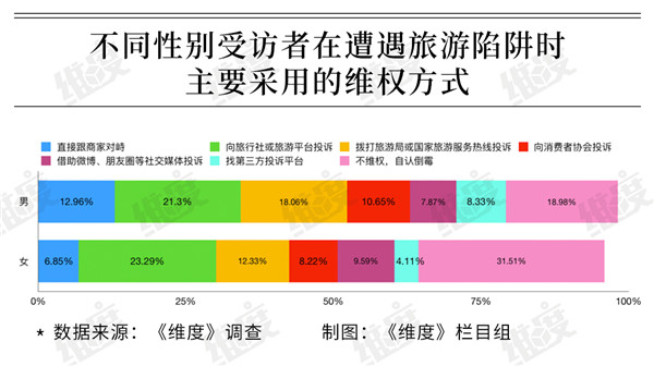 《维度》还发现,在维权方式的选择上,不同性别表现出明显差异:忍气吞声的女性受访者占比超过3成,远超男性不到2成的同比数据;而直接跟商家对峙的男性比女性多出将近1倍。