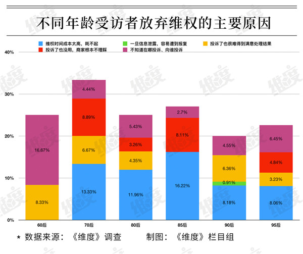 不过,《维度》也注意到,排在第二位的原因是“不知道在哪投诉、向谁投诉”,占比超过2成。从年龄上来看,这一点在60后和95后中占比较大。